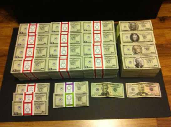 We carry $35,000,000.00 in prop cash. Our "USA LOOK" custom designed fake cash has been used in many motion pictures, and theatrical productions. We have over 50 safety features in our custom artwork. Each bill is two sided, and approximately the size of USA currency.  We have $100.00, $50.00, $20.00, $10.00 and $5.00 denominations. We rent pro prop “fake" cash, or money in the Toronto area. We sell around the world.